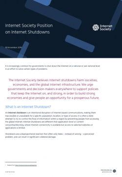 The Internet Society believes Internet shutdowns harm societies, economies, and the global Internet infrastructure. We urge governments and decision-makers everywhere to support policies that keep the Internet on, and strong, in order to build strong economies and give people an opportunity for a prosperous future.